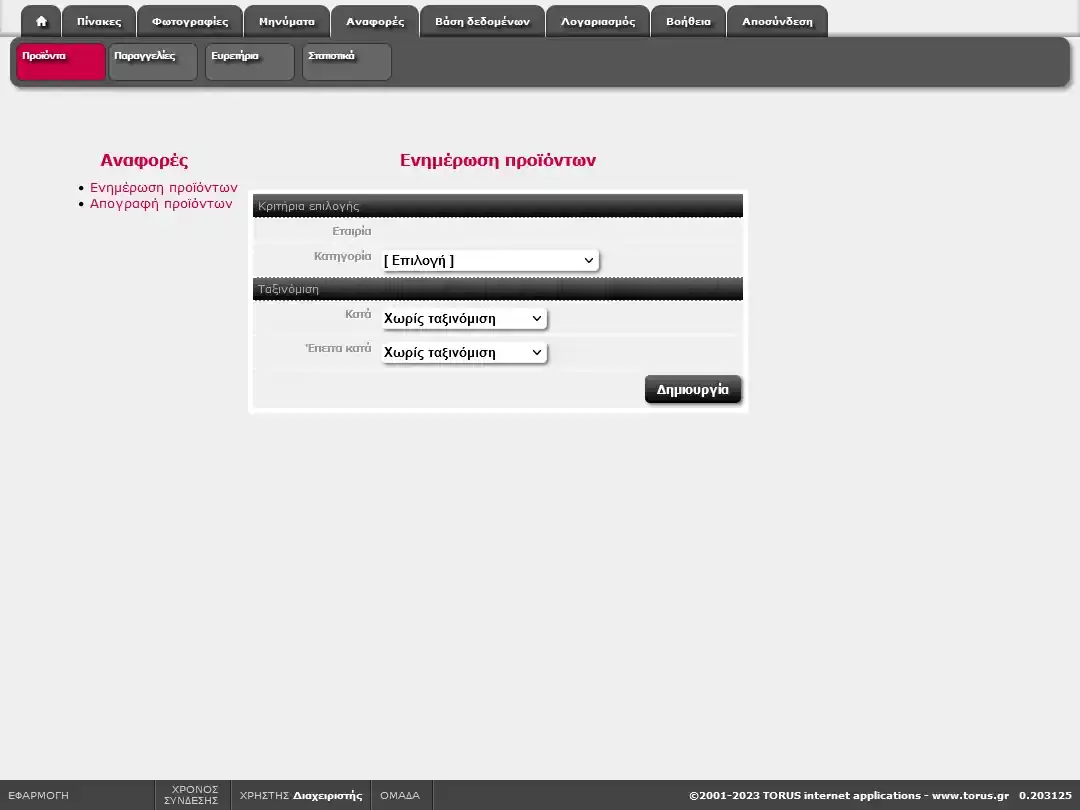 Το τμήμα αναφορών είναι οι λειτουργίες αυτές που επιτρέπουν την άντληση στοιχείων χρήσης και λειτουργίας του shop@web. Χωρίζεται σε θεματικές ενότητες όπως: