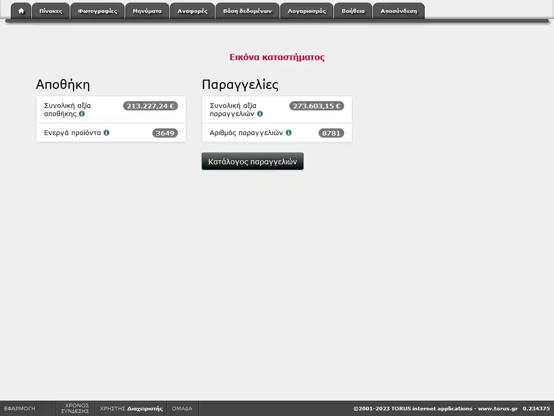 Στην αρχική σελίδα της εφαρμογής εμφανίζονται συγκεντρωτικές πληροφορίες της λειτουργίας του καταστήματος.