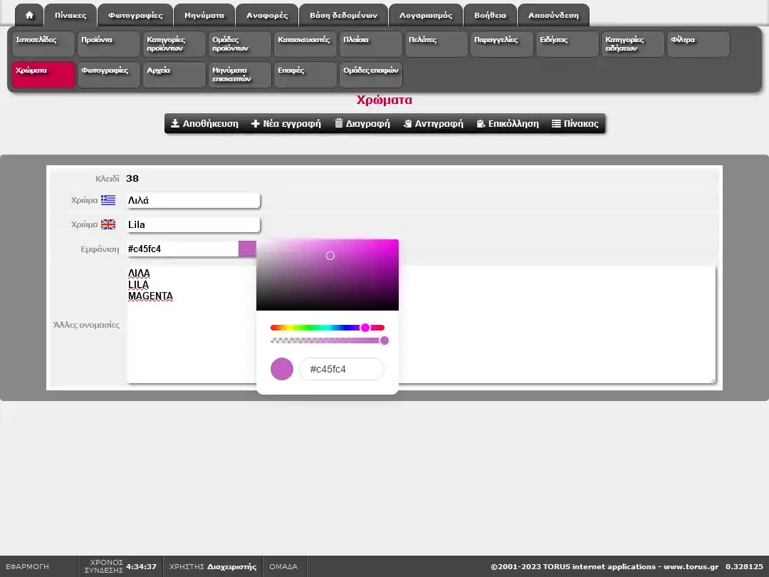 | Άλλες ονομασίες | Άλλες ονομασίες του χρώματος που καταχωρούμε, σε κάθε γλώσσα. Χρησιμοποιείται στην αναζήτηση και στην αναγνώριση του χρώματος από πηγές δεδομένων. |