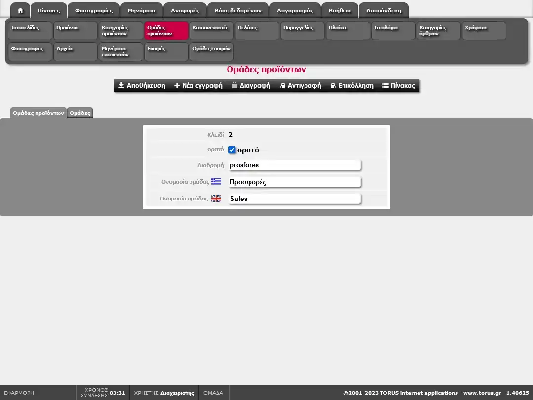 Για να προσθέσουμε προϊόντα, κάνουμε μεταβολή της ομάδας προϊόντων και επιλέγουμε την καρτέλλα [Ομάδες]