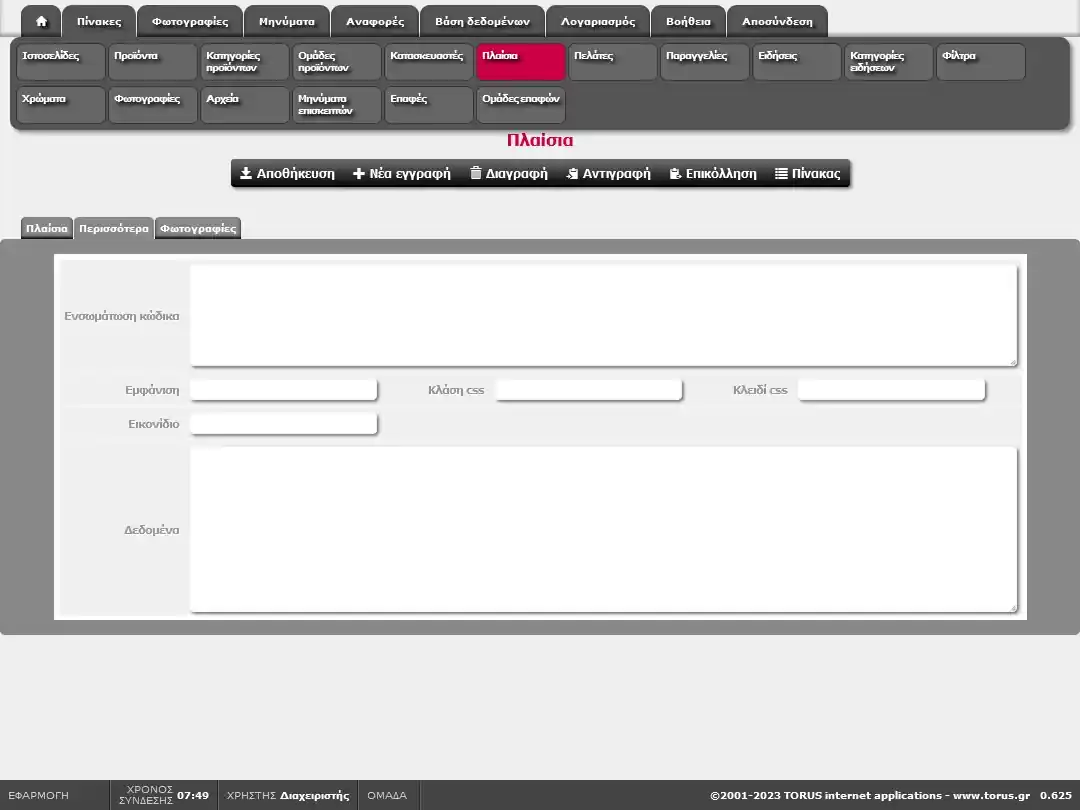 Ο πίνακας πλαισίων περιλαμβάνει εγγραφές που αποθηκεύουν περιεχόμενο (τίτλους, κείμενα, συνδέσμους, φωτογραφίες) που εμφανίζονται ομαδοποιημένα σε μια ή περισσότερες ιστοσελίδες του site ως πρόσθετο περιεχόμενο.