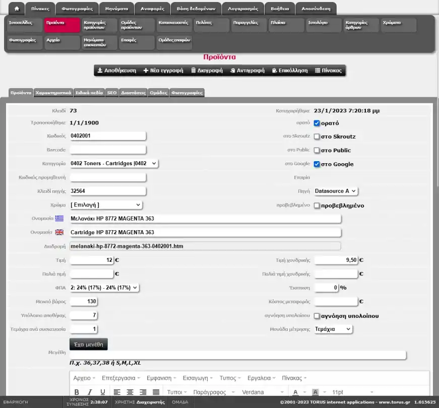 | Κωδικός | Κωδικός που αποδίδεται στο προϊόν με βάση την κατηγορία που ανήκει και έναν αύξοντα αριθμό. Ο κωδικός ενημερώνεται αυτόματα όταν αλλάξει η κατηγορία του |